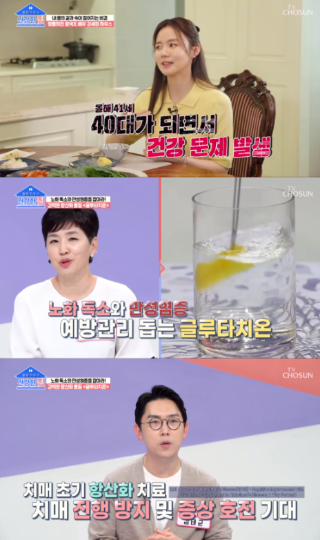 그는 평소 수상스키, 웨이크 보드, 승마, 사이클, 필라테스, 수영, 골프, 헬스 등 각종 운동을 즐긴다며 "운동 부심"을 보였지만, 이내 "앞에 숫자가 바뀌면서 확실히 몸이 달라지는 걸 느낀다"며 고민을 토로했습니다. 올해로 41세인 강세정의 고민은 체력 저하와 만성피로, 높은 공복혈당 수치와 피부 탄력 저하 등이었습니다. 강세정은 "나이가 들면서 만성 염증이 드러나고 피부 손상도 심해지기 시작했는데 이게 간 해독력이 약해지고 항산화력이 떨어져서 그런 거였다"라며 관리를 위해 글루타치온을 챙겨 먹는다고 소개했습니다.