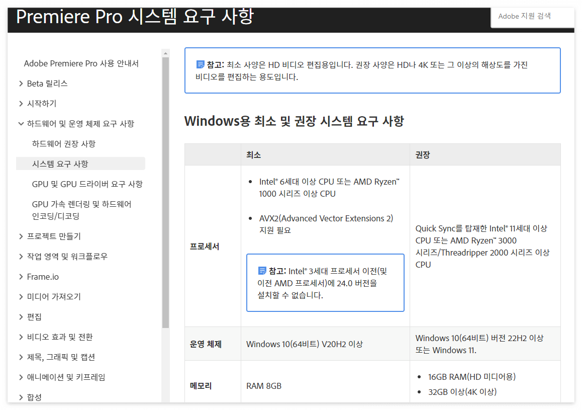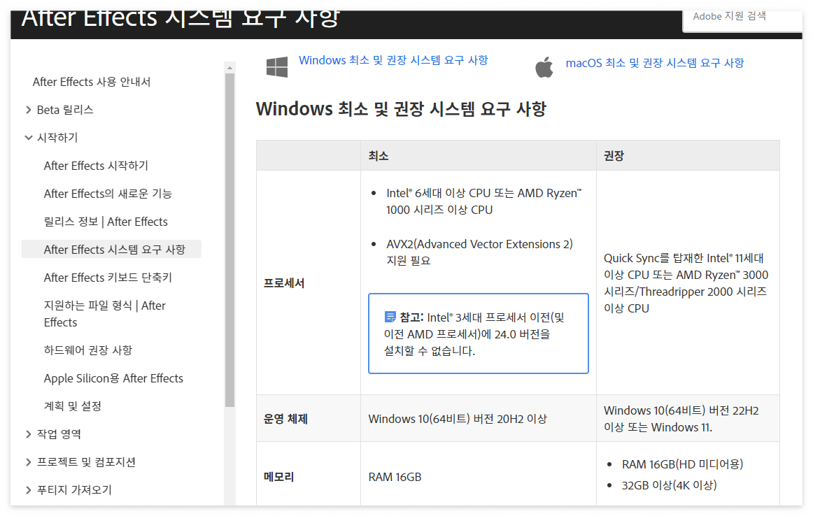 포토샵 일러스트레이터 프리미어프로 에펙 공식 시스템 요구사항.