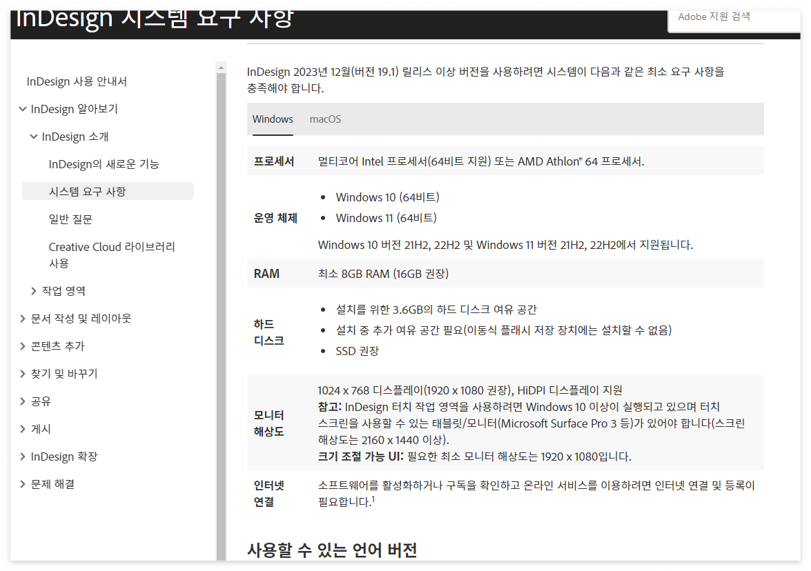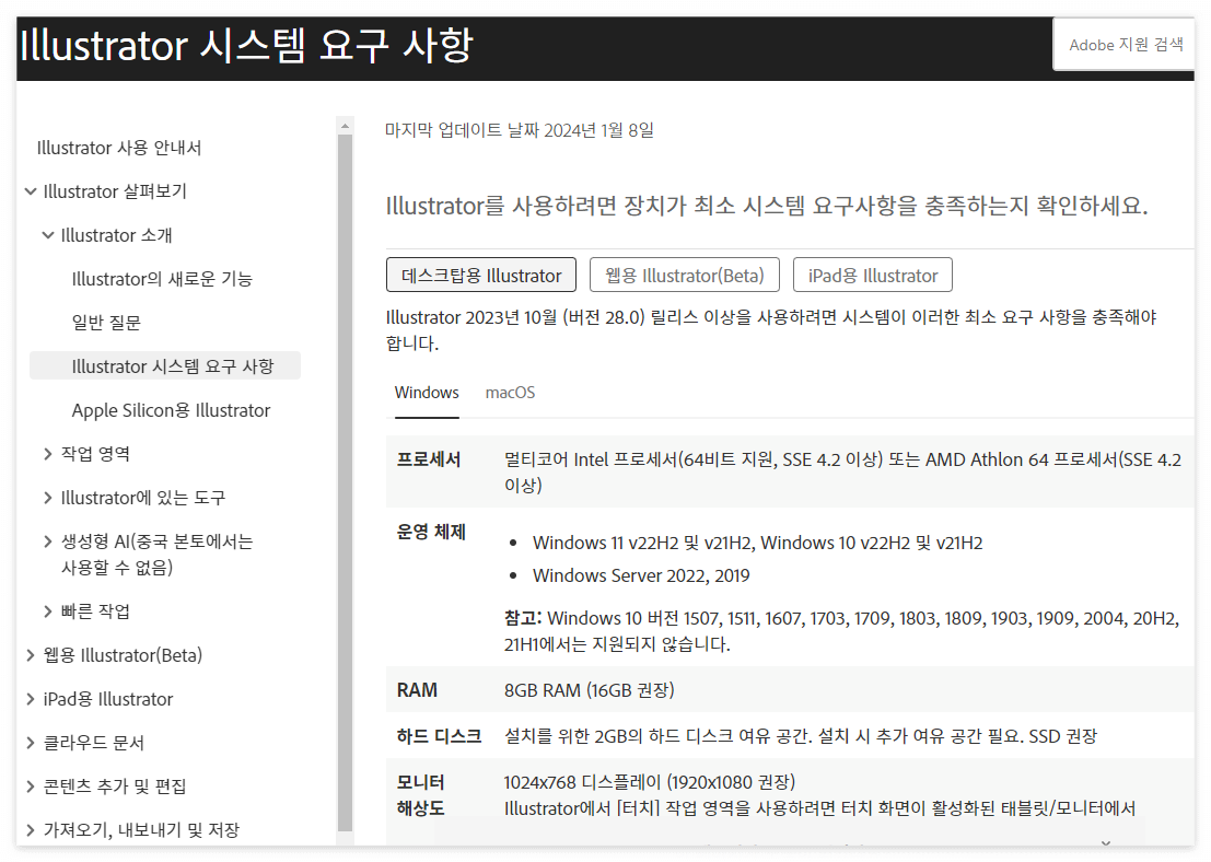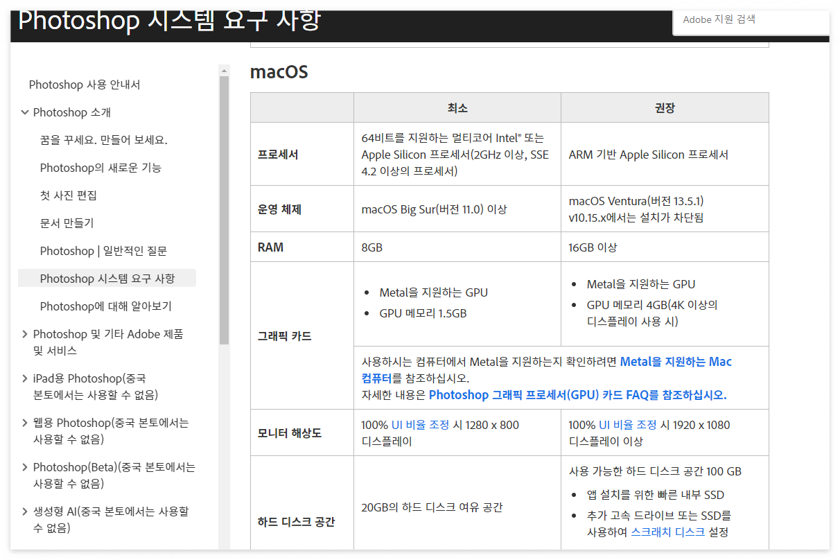 아래 사진을 눌러보세요. 어도비에서 직접 포토샵 일러스트레이터 인디자인 프리미어 프로 애펙 등의 공식 시스템 요구 사항을 정리한 내용입니다. 포토샵, 일러스트레이터, 인디자인 프리미어 프로 애펙 등을 하실 분은 꼭 알고 있어야 합니다. 맥, 윈도우 모두 포토샵 공식 시스템 요구 사항이 명시 돼 있으니 이상한 곳에서 견적 매기지 마세요. 아래 사진을 누르면 공식 포토샵 일러스트레이터 인디자인 프리미어프로 애펙 각각의 시스템 요구 사항으로 들어갑니다.