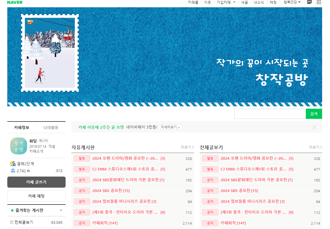 보통 영상 필사라는 건 영화나 드라마를 보면서 대본의 형식을 한번 본인 생각대로 작성하는 걸 말합니다. 하지만 그게 초보에게 쉬울 리가 없습니다. 그렇기에 실제로 방송된 단막극이나 시나리오 대본은 비밀리에 카페에 공개된 게 꽤 있습니다. 그런 걸 컴퓨터 화면에 띄어놓고 시나리오 대본과 영상은 어떻게 다른 전개를 보이는지 따지면서 시나리오 대본에 영화나 드라마에서만 보이는 대사와 장면을 추가하면 되는 것이죠. 보통 영상화로 된 대본은 수정된 부분이 꽤 됩니다. 그런걸 필사하는 거예요. 쉽게 말해서 영화나 드라마의 영상화된 내용과 그저 대본인 같은 내용과 다른 내용을 비교하면서 대본을 영상처럼 글로 완성해보고 그다음에는 각 캐릭터별 성격, 이 영화나 드라마가 어떤 주제를 말하는지 따져보기도 하고 어떤 여운이 남는지 왜 재밌는지 등등 다 따지면서 문서로 정리를 따로 해야하는 거예요. 아래는 드라마 대본이 많은 카페입니다. 사진을 누르면 해당 사이트로 이동합니다.