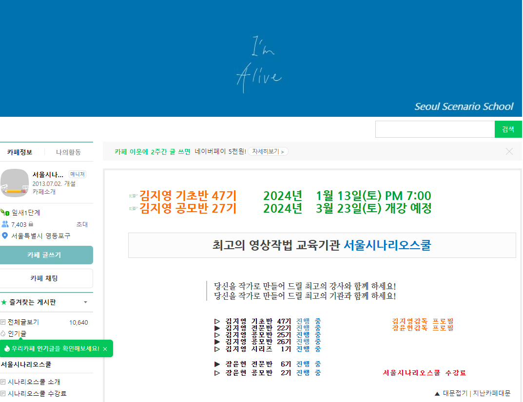 이것도 제가 실제로 기초반 전문반 공모반을 다 들었던 학원으로 서울시나리오학원을 추천합니다. 유대헌 한국드라마아카데미는 드라마 영역에 특화된 학원이라면 이 학원은 영화감독과 영화시나리오에 강화된 학원입니다. 특히, 다른 수업보다 김지영 감독님의 수업은 끝내주게 좋습니다.