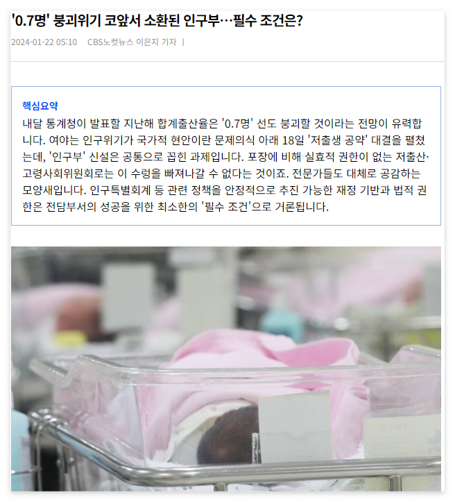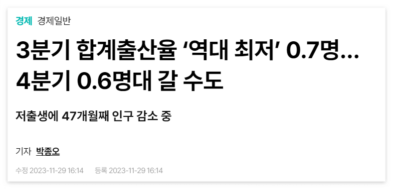 ' 2023년 3분기 기준으로 합계출산율이 0.7명' 관련 기사는 아래 기사