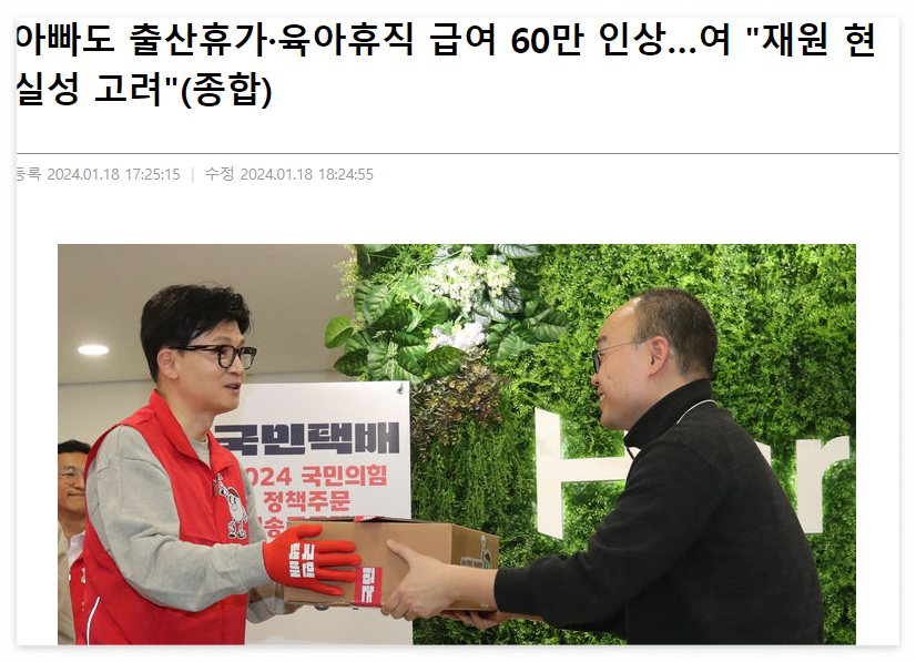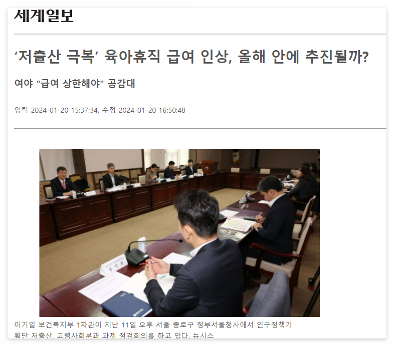 '육아휴직 급여를 인상하는 방안을 모색'관련 기사는 아래.