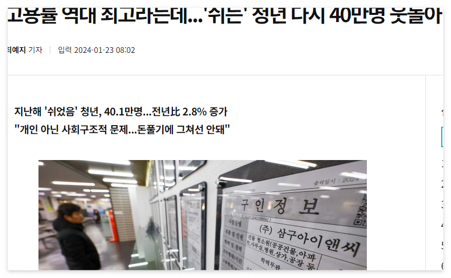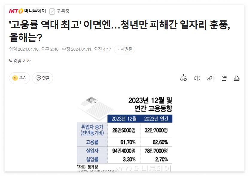 지난 해, 한국에서는 고용률이 역대 최고치를 기록하고 실업률은 역대 최저를 달성했습니다. 그러나 이러한 고용 성장은 청년들에게는 영향을 주지 못한 것으로 나타났습니다. 앞으로 올해에는 고용 증가율이 둔화될 것으로 예상되며, 이는 건설업의 침체 등이 영향을 미칠 것으로 보입니다. 2023년 12월 및 연간 고용 동향에 따르면, 작년에는 연간 취업자 수가 전년 대비 약 32만7천명 증가하여 2,841만6천명으로 기록되었습니다. 이로써 2022년에는 81만6천명의 고용 증가를 보이며 22년 만에 최대 폭으로 증가했습니다. 고용률은 15세 이상에서 62.6%로 상승하여 1963년 이래 최고치를 기록했습니다. 또한, OECD 기준인 15∼64세 고용률도 0.7%포인트 상승한 69.2%로 최고를 달성했습니다. 그러나 청년 층에서는 취업자 수가 9만8천명 줄어들었습니다. 이는 청년 인구 감소와 함께 '쉬었음' 청년의 증가로 인한 것으로, 청년 고용 상황이 여전히 어려운 것으로 나타났습니다. 올해에는 취업자 수의 증가율이 둔화될 것으로 예상되며, 건설업의 침체 등이 영향을 미칠 것으로 관측되고 있습니다. 따라서 정부는 일자리 창출에 집중할 계획이며, 2024년 고용률은 개선되겠지만 취업자 수 증가율은 둔화될 것으로 전망되고 있습니다. 아래 사진을 누르면 해당 기사의 원문을 정확하게 보실 수가 있습니다.