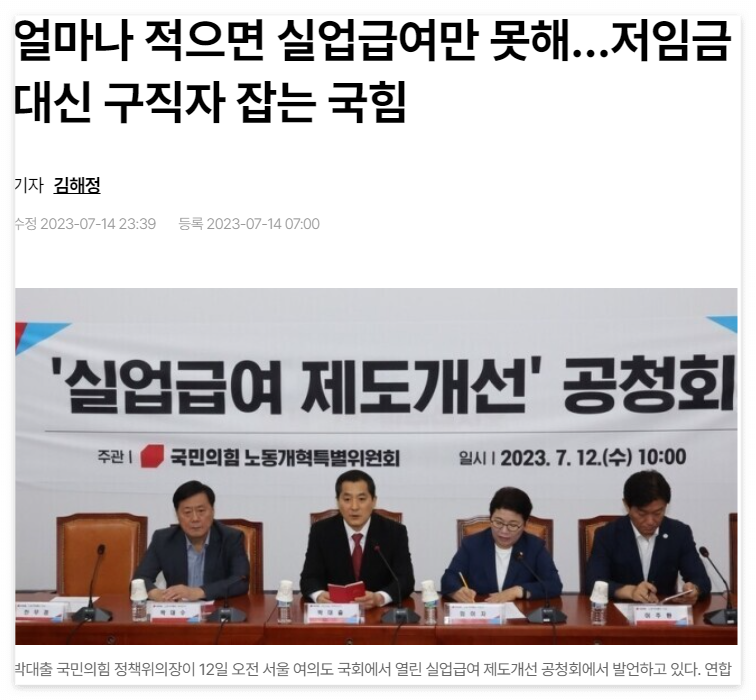 주장 : 노동개혁특별위원회는 세후 월급과 실업급여 하한액 사이의 역전 현상이 존재한다고 주장합니다. 이를 근거로 세후 최저임금보다 낮은 금액을 받는 실업급여 수급자가 28%나 된다고 주장합니다.