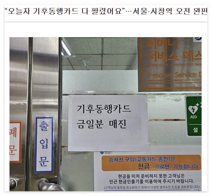 서울시가 판매하는 '기후동행카드'는 열띤 관심을 받고 있으며 첫날인 23일 오전에 서울역 및 시청역, 사당역 등에서는 실물카드 물량이 완판되었습니다. '기후동행카드'는 월 6만2000원으로 서울시 지하철, 버스 등 대중교통을 무제한으로 이용할 수 있는 대중교통 통합 정기권이며, 추가 3000원을 내면 서울시의 공공 자전거인 따릉이도 무제한으로 이용할 수 있습니다. 카드는 실물카드와 모바일 카드 형태로 나오며, 실물카드를 구매하고 충전하는 방법은 간단합니다. 실물카드를 구매하려면 서울교통공사 1~8호선 고객안전실을 방문하여 현금 3000원을 내면 됩니다. 다만, 신용카드나 모바일 간편결제 앱으로는 결제할 수 없습니다. 현장에서 기후동행카드를 구매한 사용자들은 주로 고령층 또는 아이폰 사용자로, 모바일 버전은 안드로이드 기반 스마트폰만 지원되기 때문에 아이폰 사용자들은 실물카드를 구매하러 방문하는 것으로 보입니다. 아래 사진 누르면 원문 볼 수 있어요.