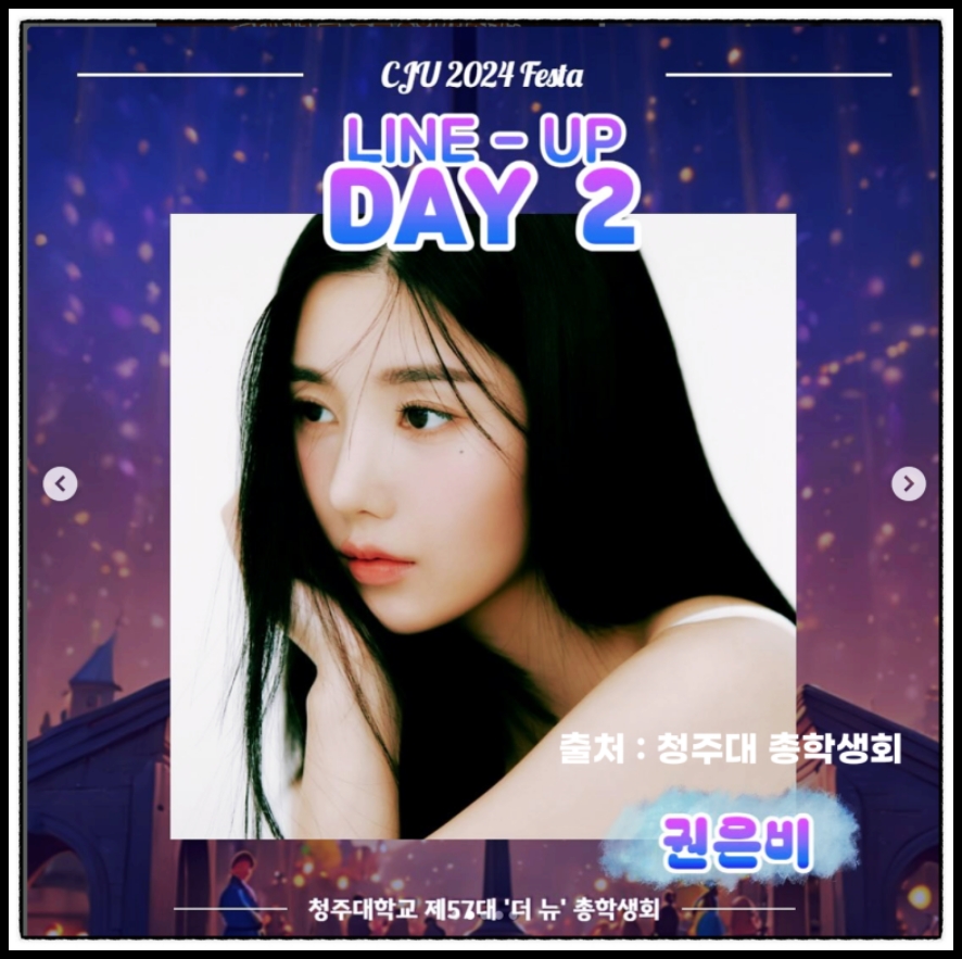 특히 이번 축제에는 재학생들을 위한 특별한 공간인 '재학생존'이 마련되어 있어 학생증이나 에델바이스를 통해 신분을 확인하면 동반 1인과 함께 입장할 수 있다고 하네요. 🎓 입장 시간은 오후 6시 30분부터 7시 30분까지이니 빨리 가시는 것이 좋겠어요! 😉 축제의 하이라이트는 역시 풍성한 라인업인데요! 🎤 첫날에는 창모, 키스오브라이프, 스테이씨의 공연이 펼쳐집니다. 🎶 세 팀 모두 요즘 가장 핫한 아티스트들이라 첫날부터 많은 인파가 몰릴 것으로 예상되네요. 🔥 둘째 날에는 요즘 가장 주목받는 솔로 가수 권은비의 무대가 준비되어 있습니다. 🌸 그녀의 매력적인 보이스와 퍼포먼스는 축제의 피날레를 화려하게 장식할 거예요! ✨ 아래의 이미지는 청주대학교 공식 인스타그램으로 바로 이동할 수 있는 이미지 버튼입니다. 시간 낭비하지마시고 공식 인스타그램으로 확인해보세요!