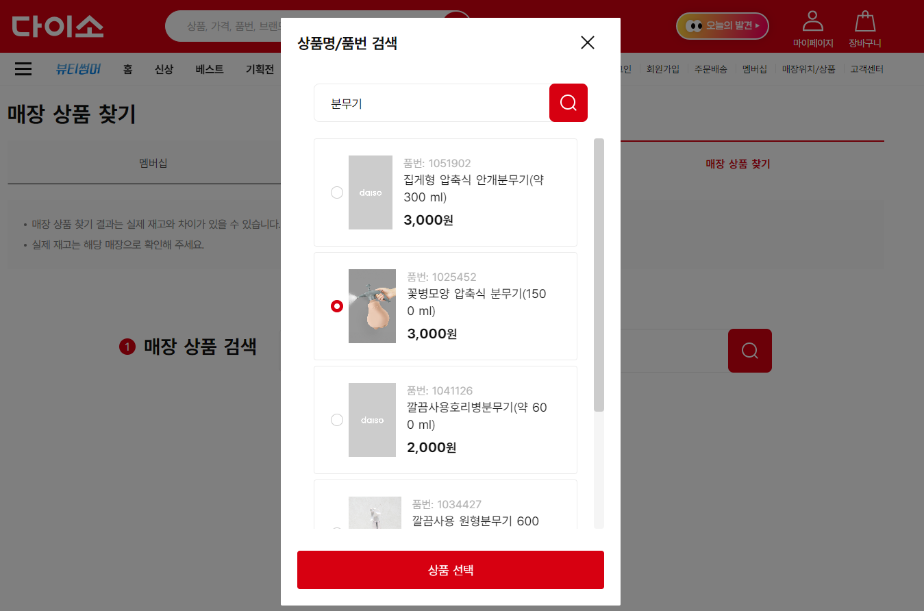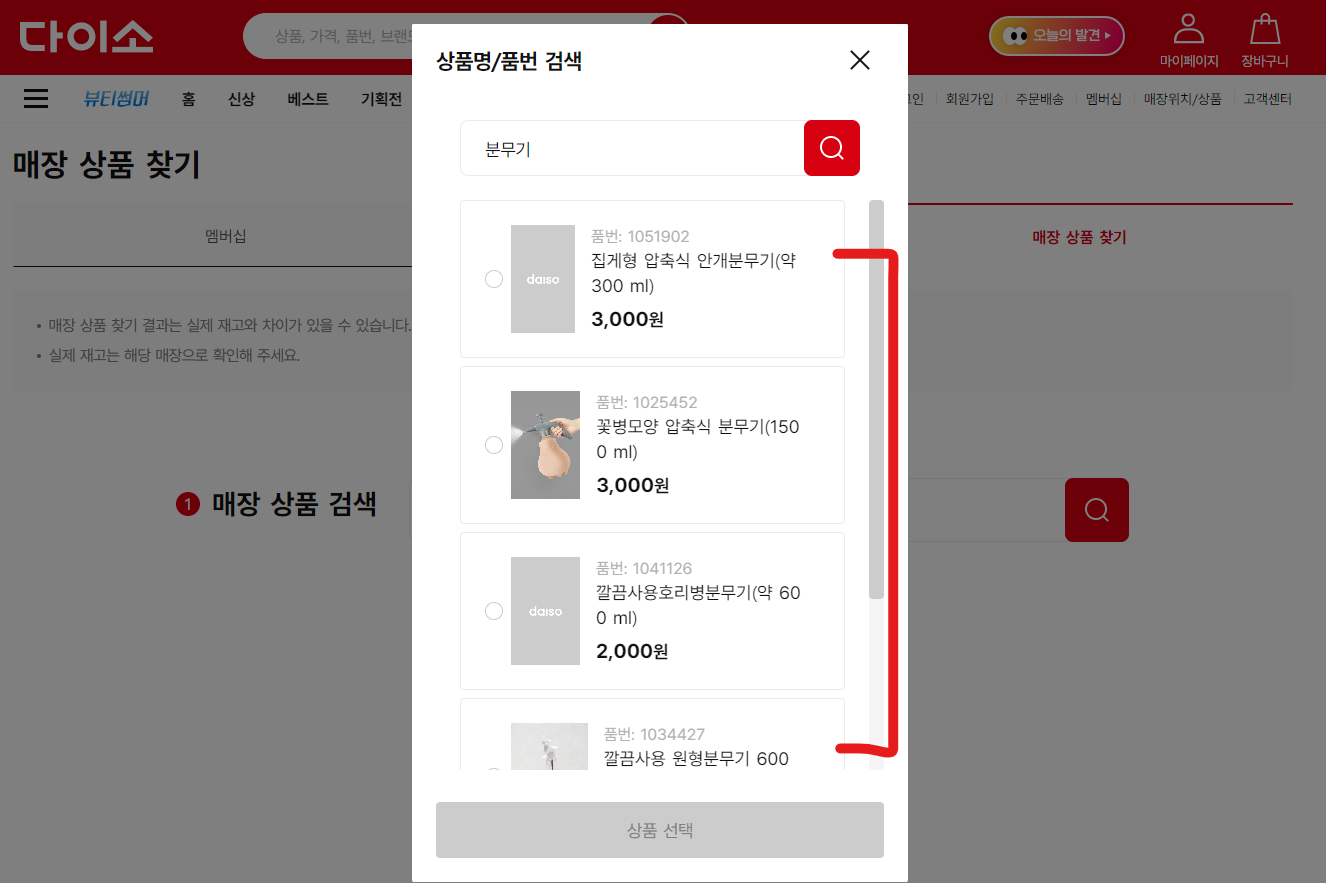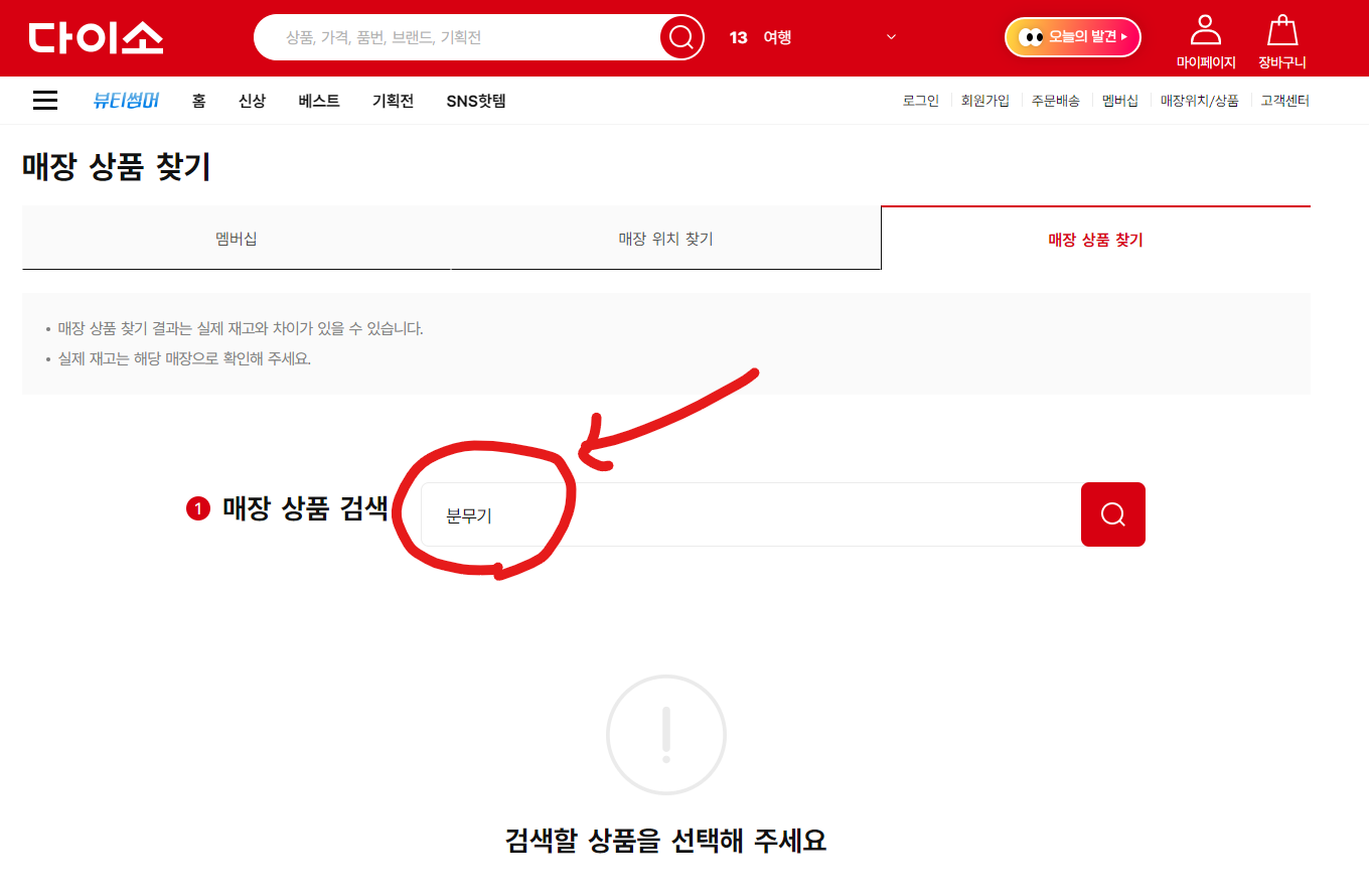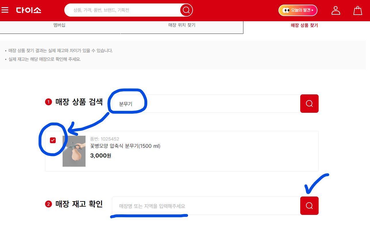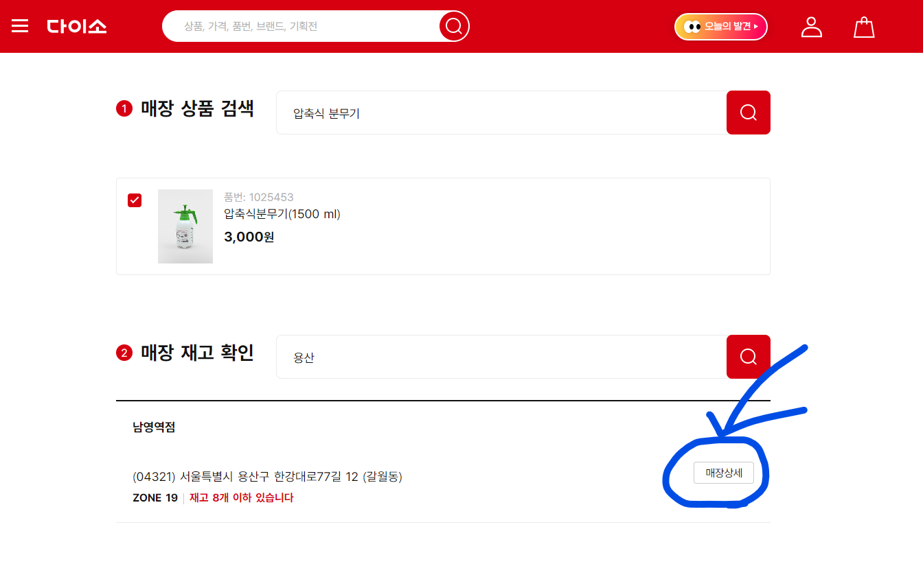 매장 재고를 알아봐야 하니까 돋보기 표시 보이시죠? 그걸 확인하고 내가 사는 지역의 다이소 매장명칭 혹은 지역명을 적어서 검색을 해보세요. 아래 사진 순서대로 작업을 진행해보세요.