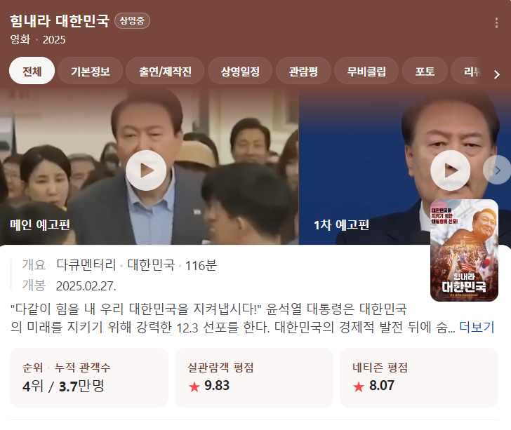 비록 흥행 성적은 기대에 미치지 못하고 있지만, 이 영화는 관람객들에게 대한민국의 역사를 바로 알고 그 가치를 지켜나가는 것의 중요성을 일깨워준 작품으로 평가받고 있습니다. "대한민국의 진짜 역사를 알아가는 여정을 멈추지 말고, 애국 시민 여러분 지치지 말고 모두 힘내시길" 바라는 마음이 이 영화에 담겨 있습니다. 아래 이미지를 누르시면 실제 네이버에서 힘내라 대한민국 개봉관을 찾으실 수 있습니다. 눌러보세요.